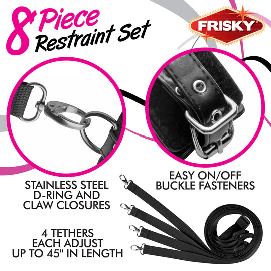 Allow yourself the freedom of giving up control with this eight piece bondage set from Frisky. Imagine yourself doted upon and teased. Lying there in sublime ecstasy, anticipating every move and waiting for the next direction....Regular price $69.95