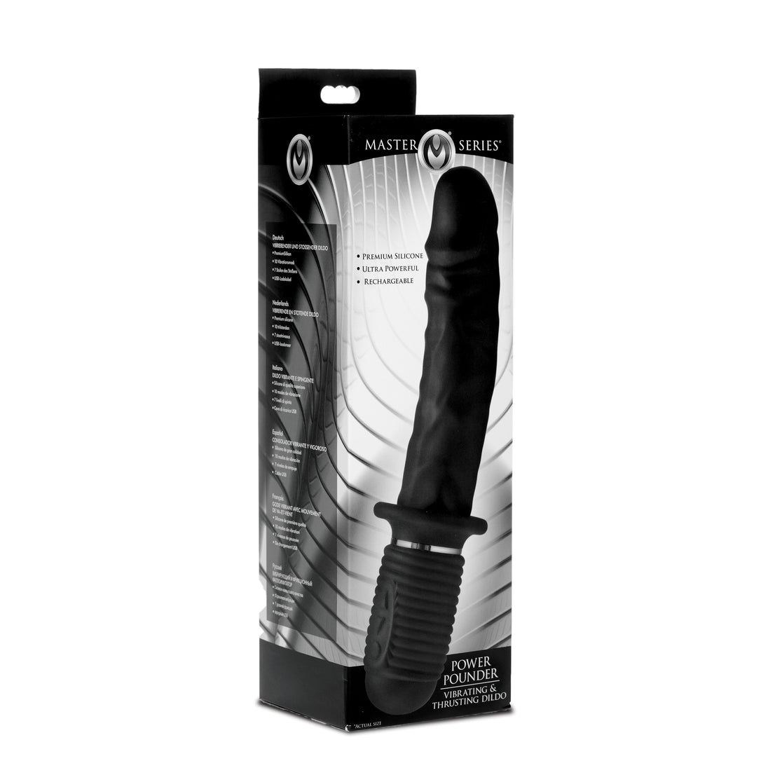 This big black boner is rechargeable for powerful vibration and thrusting action! Grab the handle and pound yourself, or your partner, into ecstasy! The ribbed silicone hilt allows you to get a secure grip while the motor does its job. Treat your orifice to 7 levels of thrusting as the supple, veiny shaft pumps up and down on its own! Meanwhile, a separate button allows you to play with 3 speeds and 7 patterns of vibration. The premium silicone material is non-porous and phthalate-free. This waterproof pleasure tool is easy to clean with mild soap or toy cleaner. Powered with patented technology. Do not use with silicone lubricants.