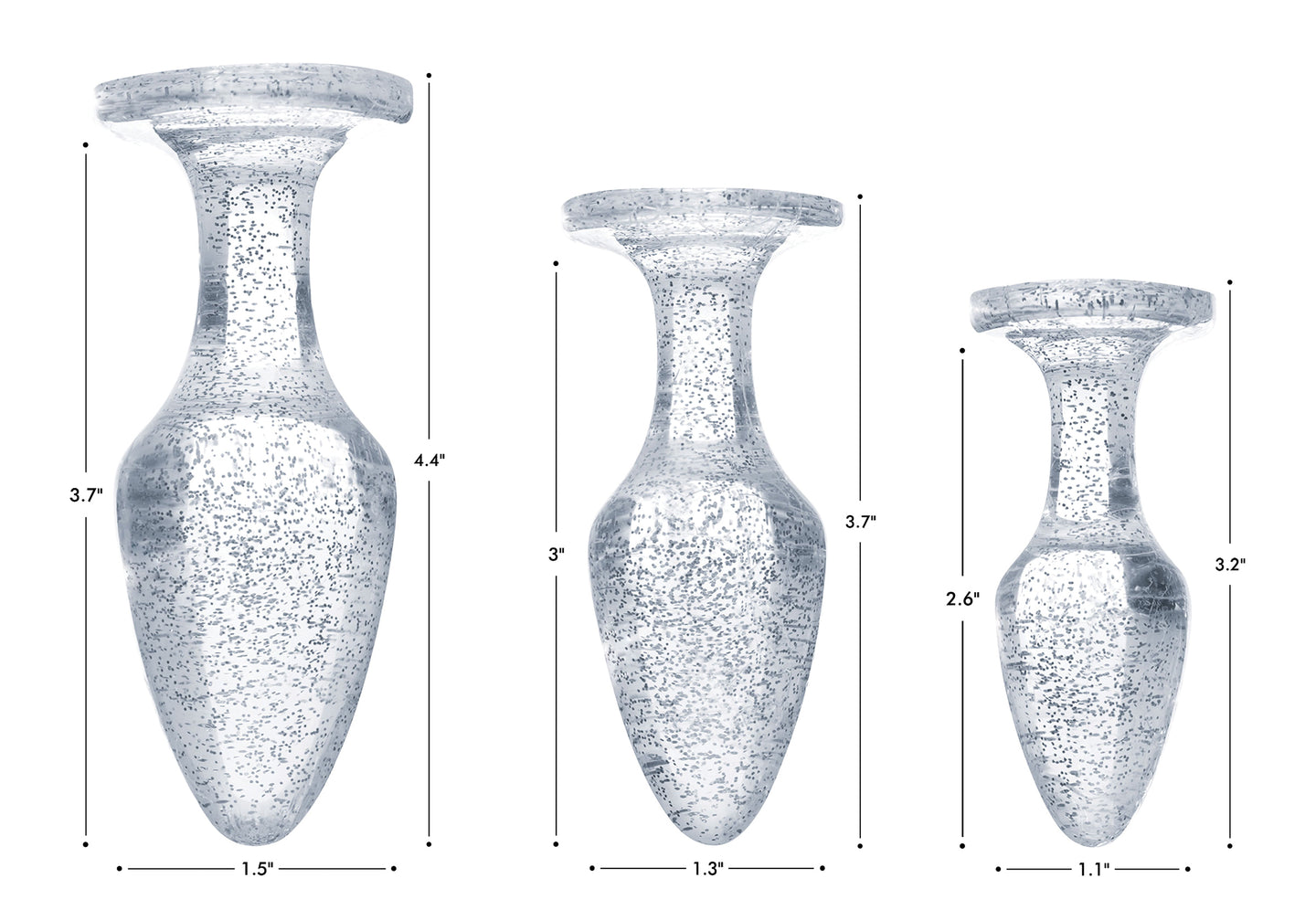 This set of smooth, solid, butt plugs feature a shiny glittery silver pattern to decorate your booty while you play! These Glitter Gem plugs are tapered, slim, and graduate in size from small to large for easy training - perfect for beginners and experts alike! Start off easy with the smallest size and get your backdoor familiar with this new sensation. The tapered tip and slender body make the smallest size the best way to introduce yourself to the world of anal play without any discomfort! Upgrade to medium and large when you think you can take it, at your own pace. Expert anal players will appreciate the ease of which to warm up their ass for further fun with this Glittery set of plugs! Choose the size that matches your comfort level and surprise your lover when you pull your pants down with this dazzling anal gem! Small Measurements : Overall length 3.2 inches, insertable length 2.6 inches, diameter at widest point 1.1 inches Medium Measurements : Overall length 3.7 inches, insertable length 3 inches, diameter at widest point 1.3 inches Large Measurements : Overall length 4.4 inches, insertable length 3.7 inches, diameter at widest point 1.5 inches Materials : Acrylic Color : Silver